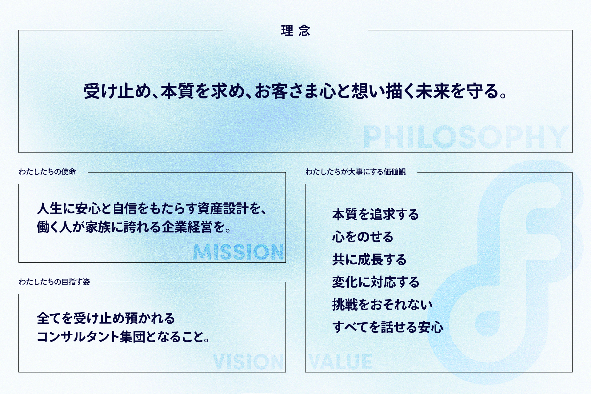 数字や仕組みだけでは測れない、”意志のかたち”をともに描き、どんな時も自信と誇りを持っていられるよう、あなたの背中を支えます。